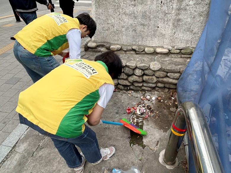 | ▲ 지난 21일 신천지자원봉사단 동작지부가 여의대방로 일대에서 거리 청소 봉사 활동을 진행한 가운데 자원봉사자들이 상가 건물 주변 쓰레기를 수거하고 있다. [사진 제공 = 신천지자원봉사단 동작지부] |