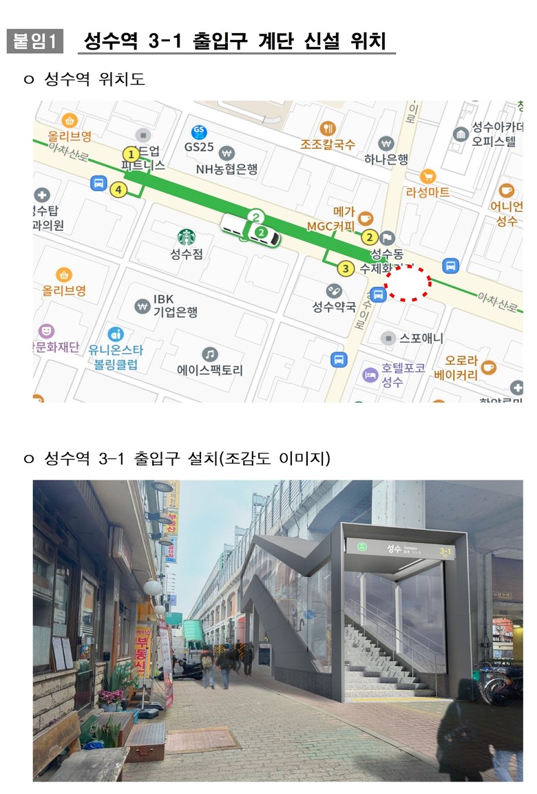 서울교통공사가 제출한 자료에 따르면, 성수역 3-1번 출입구는 2025년 말 착공해 2026년 완공을 목표로 추진되며, 총사업비 약 19억 원이 투입된다. 황 위원장이 제시한 ‘경제성을 확보하면서도 안전을 담보하는 방안’이 현실화된 것이다.