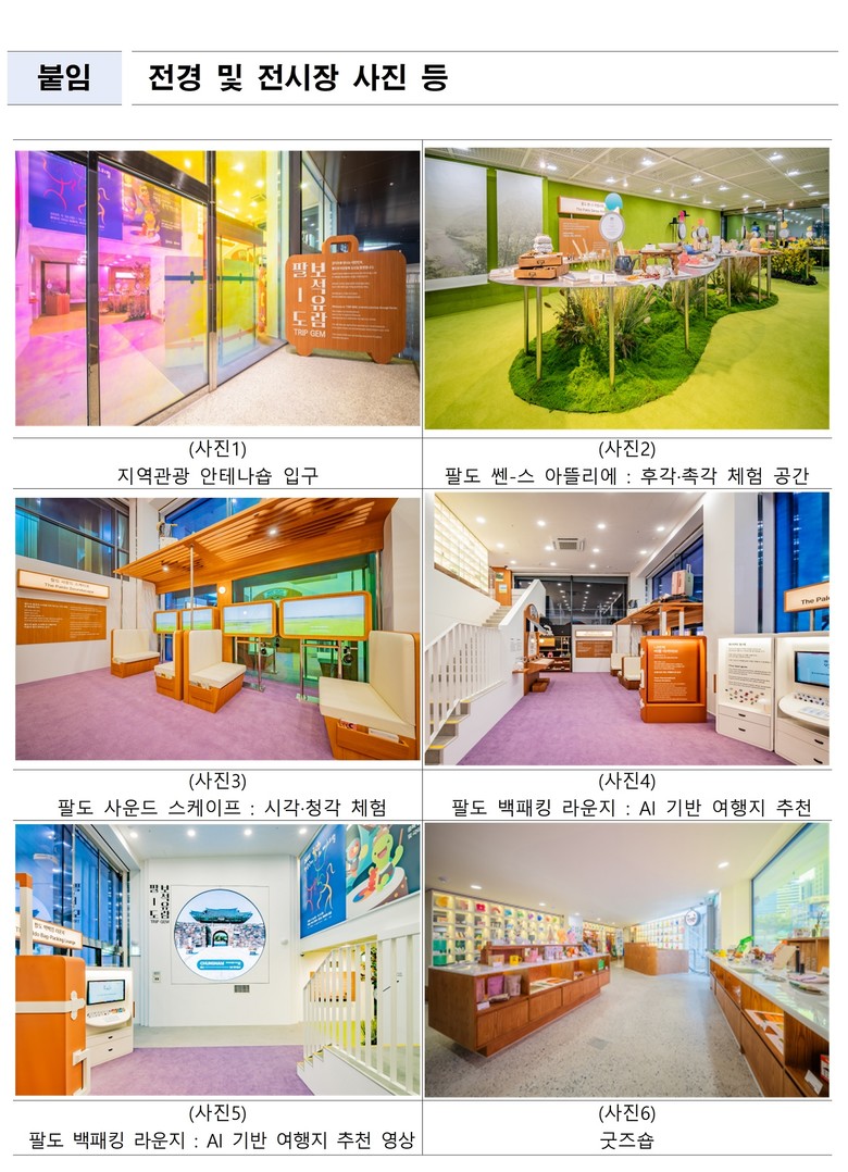 전시관은 ▴팔도 쎈-스 아뜰리에(후각·촉각 체험존) ▴팔도 사운드 스케이프(시각·청각 체험존) ▴팔도 백패킹 라운지(AI 기반 여행지 추천) 의 세 공간으로 구성, 즐길 거리를 제공한다. 다양한 체험을 끝낸 관람객들은 마음에 든 지역을 형상화한 나만의 열쇠고리도 만들어 볼 수 있다.
