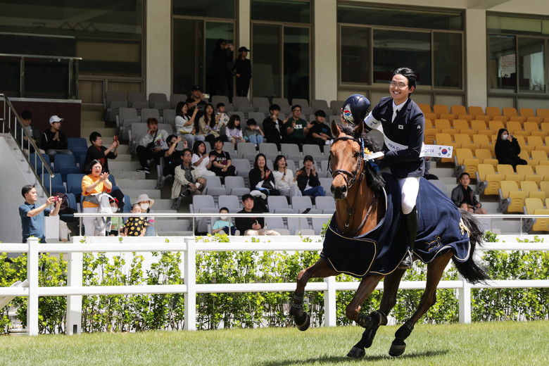 [세계타임즈 = 송민수 기자] 지난 5월 10일(금)부터 12일(일)까지 한국마사회(회장 정기환) ‘88승마경기장’에서 열린 ‘2024 KRA컵 아시아 주니어 승마대회(KRA CUP CSIJ-B* Seoul 2024)’막을 내린 가운데 한국의 김형호(천안중앙고부설방송통신고)선수가 장애물 개인전 110cm 경기에서 승용마 ‘한화카라노’와 우승을 차지했다.