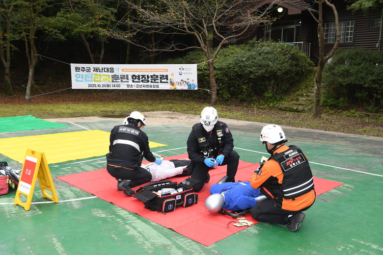 이번 훈련은 집중호우로 인한 산사태 발생 상황을 가정한 실전형 훈련으로, 완주경찰서·완주소방서·완주군시설관리공단 등 16개 유관기관과 단체가 함께 참여했다.