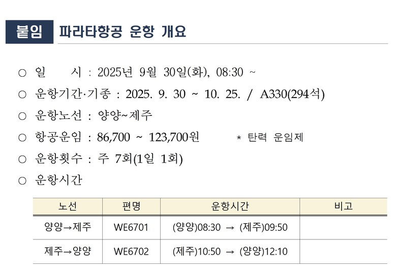 손창환 강원특별자치도 글로벌본부장은 “파라타항공이 조기에 정상 궤도에 오를 수 있도록 행정적·재정적 지원을 아끼지 않겠다”고 밝혔다.