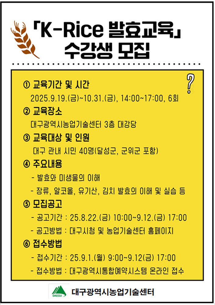 ▸ 9월 1일부터 접수 시작, 대구시 통합예약시스템에서 신청 가능 [세계타임즈=대구 한윤석 기자] 대구광역시농업기술센터(소장 김수진)는 오는 9월 19일부터 10월 31일까지 진행되는 ‘K-Rice 발효과정’ 교육을 앞두고, 발효 전문가로 성장할 수강생 40명을 모집한다.