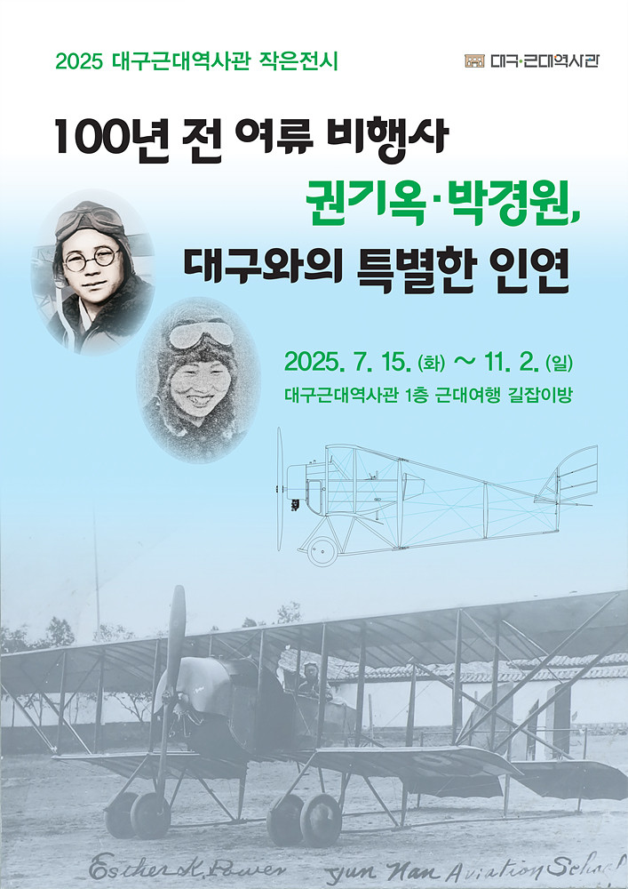 이번 행사는 1부에 공군사관학교 김기둥 교수의 ‘일제강점기 비행장과 비행사, 대구비행장’ 특강이 진행되며, 2부에서는 ‘100년 전 여류 비행사 권기옥·박경원, 대구와의 특별한 인연’ 전시 해설이 있다.