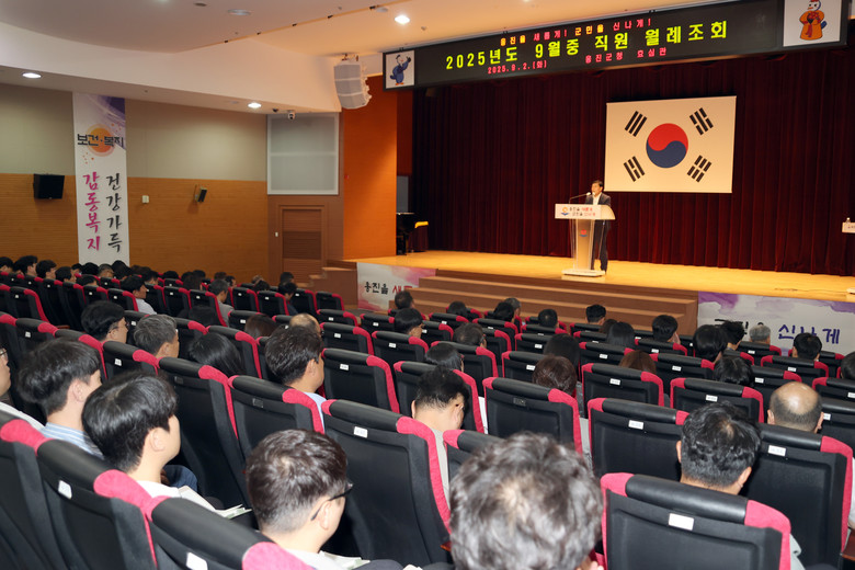 [옹진군 세계타임즈=심하린 기자] 옹진군(군수 문경복)은 2일, 효심관에서 전 직원들이 참석한 가운데 ‘9월 중 월례조회’를 개최하고, 다가오는 군민의 날 행사와 내년도 예산 편성, 추석연휴 종합대책 등 군정 주요현안에 대한 공유와 실천을 다짐하는 시간을 가졌다고 밝혔다.