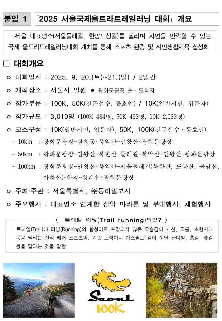 - 市, “‘서울다운 달리기’를 즐길 수 있는 국제 울트라트레일러닝 대회로 특별한 추억 될 것” [서울 세계타임즈=이장성 기자] 아름다운 서울 도심의 산과 강, 거리와 광장을 잇는 100㎞ 초대형 코스를 달리는 특별한 대회가 펼쳐진다. 서울시와 ㈜동아일보가 공동 주최하는 ‘2025 서울국제울트라트레일러닝대회(이하 ‘서울100K’)’가 9월 20일(토)부터 21일(일)까지 서울 전역에서 열린다.