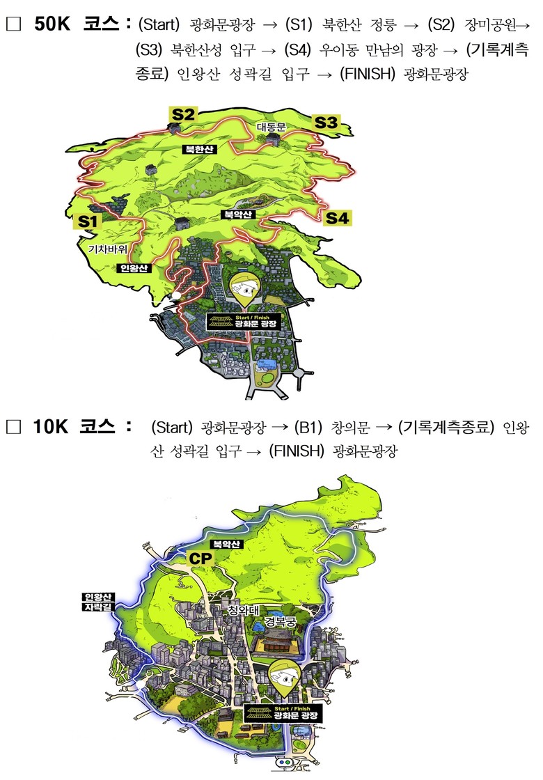 ○ (50㎞ 코스) 트레일러닝을 달려본 경험이 있는 전문 선수나 동호인을 위한 맞춤형 코스다. 하늘길과 성곽을 잇는 코스로 구성되어 참가자들은 광화문광장에서 출발하여 인왕산~북한산~북악산을 잇는 서울의 주요 능선을 지나 성곽길을 넘어 광화문광장으로 출발 당일 오후 7시까지 되돌아오면 된다.