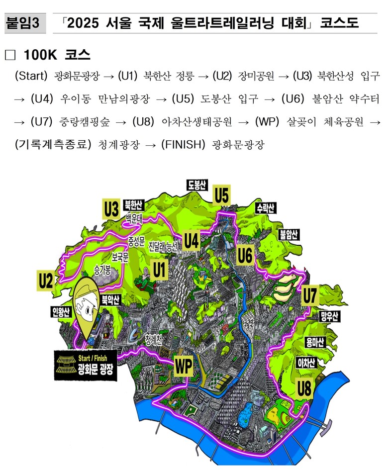 올해로 6회째를 맞이한 ‘서울100K’는 광화문광장에서 출발해 인왕산~북악산~북한산~도봉산~아차산을 거쳐 한강과 청계천을 지나 다시 광화문광장으로 돌아오는 100km 코스로 서울의 다채로운 매력을 한 번에 체험할 수 있는 유일한 대회이다.