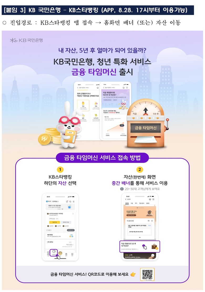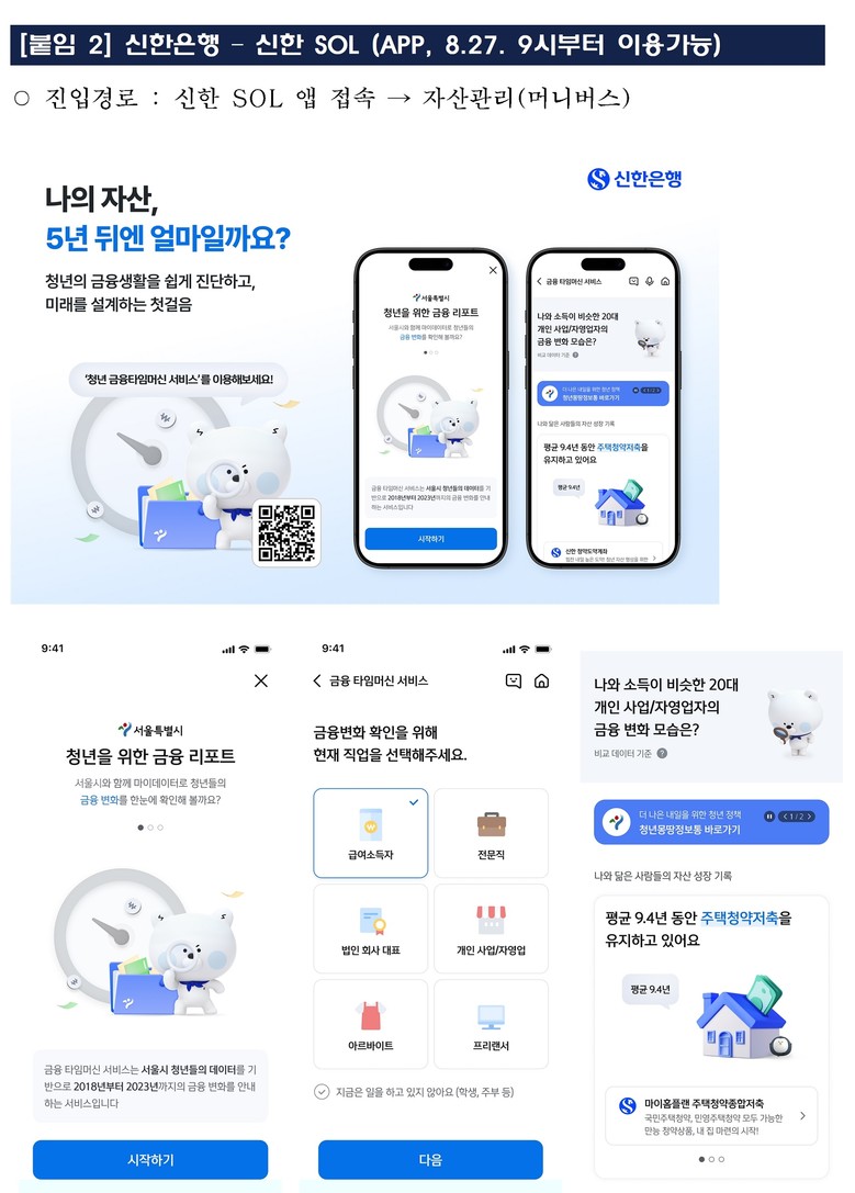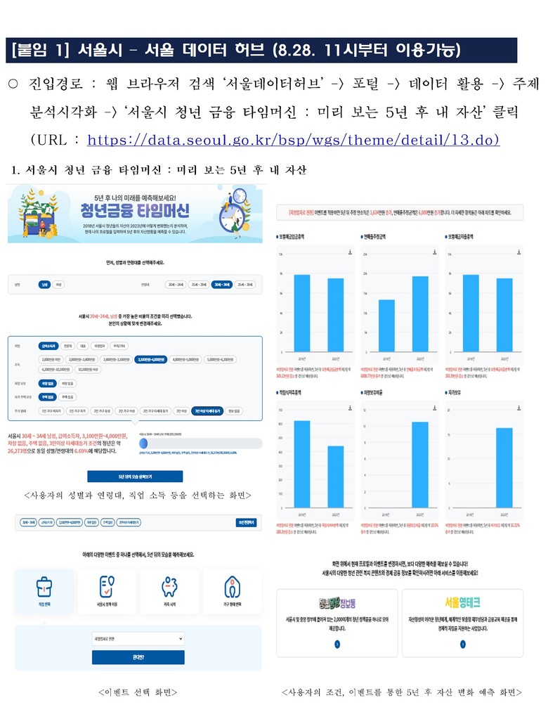 서울시는 28일(목)부터 신한은행·KB국민은행·우리은행 등 주요 은행과 협력해 미래 금융‧경제상황을 미리 체험할 수 있는「청년 금융 타임머신 서비스」를 시작한다고 밝혔다. 공공과 민간의 데이터 협력를 통해 청년맞춤형 금융서비스를 구현한 첫 사례다.