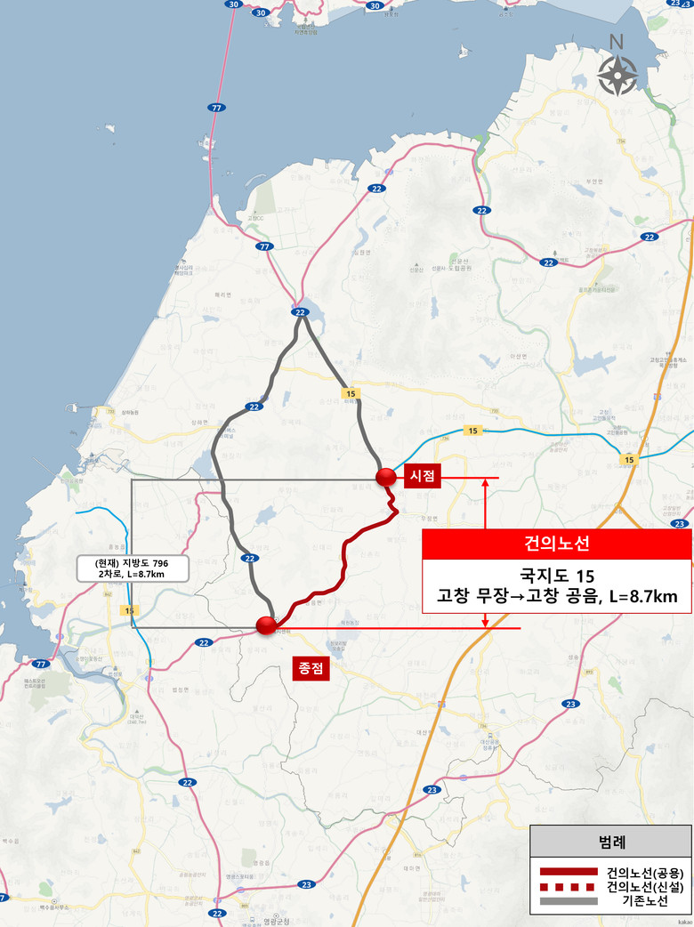 11일 고창군에 따르면 최근 국토교통부의 일반국도, 국지도 승격·지정 고시에 ‘고창군 무장-공음간 지방도 796호선(8.7㎞)’이 전북에서 유일하게 포함됐다.
