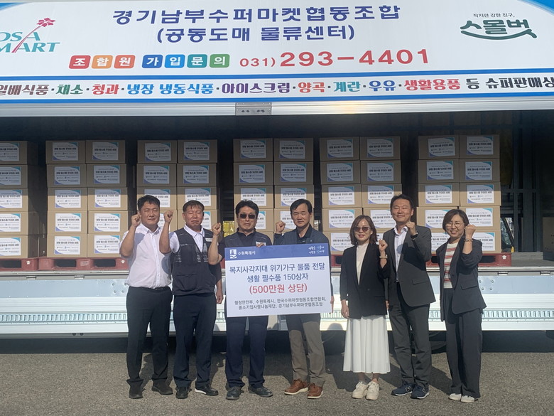 25일 수원중소유통공동도매물류센터에서 열린 후원 물품 전달식에는 황철성 경기남부수퍼마켓협동조합 이사장, 곽노준 한국수퍼마켓협동조합 본부장, 이원구 수원시 경제정책국장 등이 참석했다.
