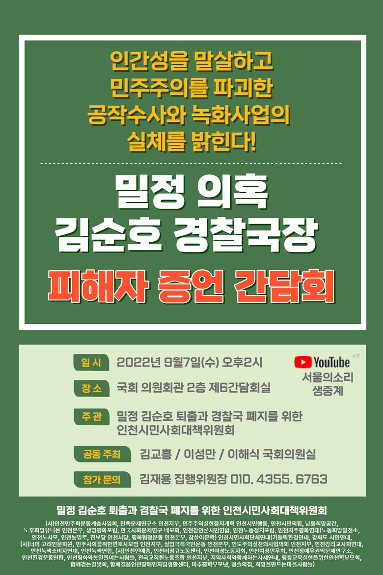 인노회와 인민노련 등 과거 노태우 정부 공안정국 조성으로 인해 피해가 컸던 인천지역 중심으로 ‘밀정 김순호 퇴출과 경찰국 폐지를 위한 인천시민사회대책위원회(대책위)’가 구성되었고 이날 토론회를 주관한다.