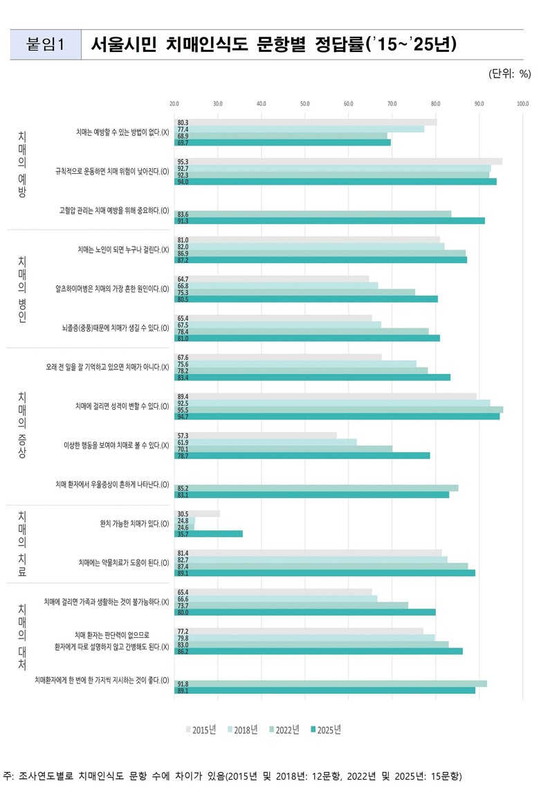 서울시는 만 19세 이상 서울시민 1,071명을 대상으로 진행한「2025 서울시민의 치매 및 경도인지장애 인식도 조사」결과를 발표했다. 관련 조사는 지난 2015년(응답자 1,000명)부터 총 4차례 이뤄졌다.