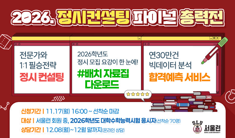 - 17일 16시부터 ‘1:1 정시 컨설팅’ 신청 접수…20년 경력 전문가가 맞춤형 전략 수립