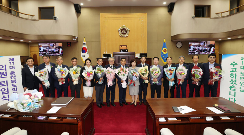 충북도의회는 30일 본회의장에서 ‘제11대 충북도의회 의원 퇴임식’을 열어 의정활동 기록을 담은 동영상 시청, 감사패와 공로패 수여 등 제11대 의회의 의정 성과를 되돌아보고 김정열 수필가의 헌정시 낭독과 기념촬영을 끝으로 퇴임식을 마무리했다.