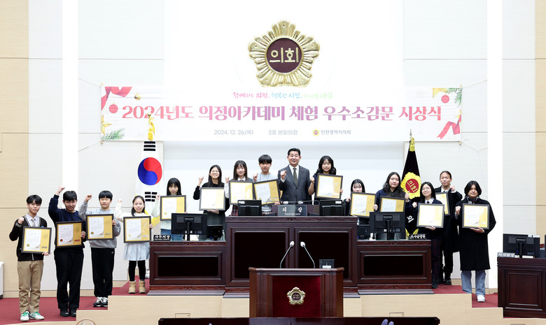 인천시의회는 26일 본회의장에서 ‘2024년도 의정 아카데미’ 체험 우수소감문 시상식을 개최하고, 최우수상자로 선정된 15명에게 상장을 수여했다.
