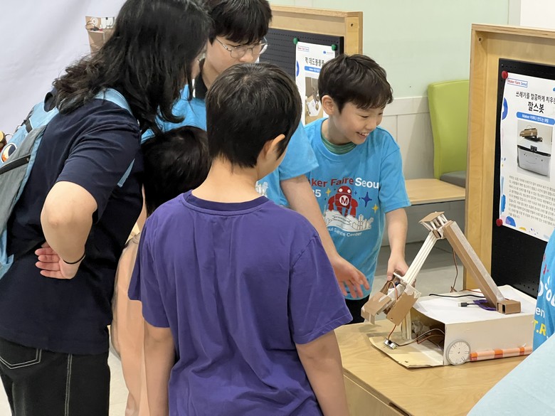 | ▲ 학생들이 메이커페어 서울에 출품한 시제품을 시연해보고 있다. |