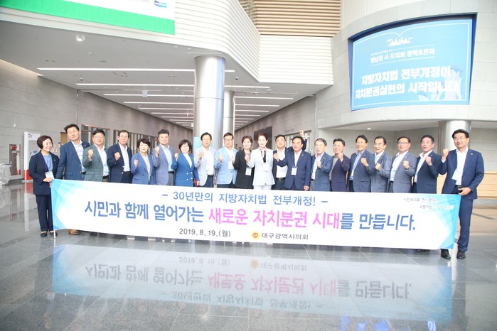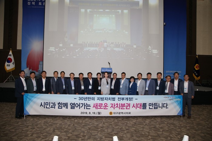 [대구=세계타임즈 한성국 기자] 대구광역시의회(의장 배지숙)는 19일 오후 2시 경주 화백컨벤션센터에서 개최된 ‘지방자치법 전부개정을 위한 영남권 시·도의회 정책토론회’에 동참하여 국회에 계류 중인 정부안의 조속한 처리를 촉구하고 아베 정부의 경제침략을 규탄하는 등 자치분권 실현을 위한 협력방안을 모색하는 데 힘을 보탰다.