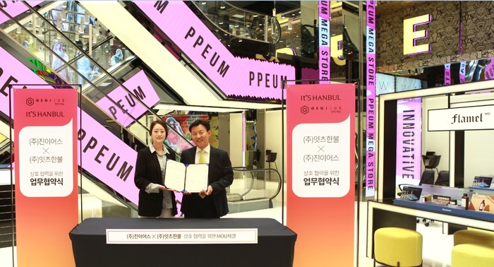 ㈜진이어스(대표 김민경)와 ㈜잇츠한불(대표 홍동석) 양사는 최근 개장한 예쁨주의 쁨의원 신논현점에서 공동 제품 개발을 통한 뷰티 신사업 추진 및 네트워크 확대를 위한 업무협약 MOU를 체결했다고 8일 밝혔다.