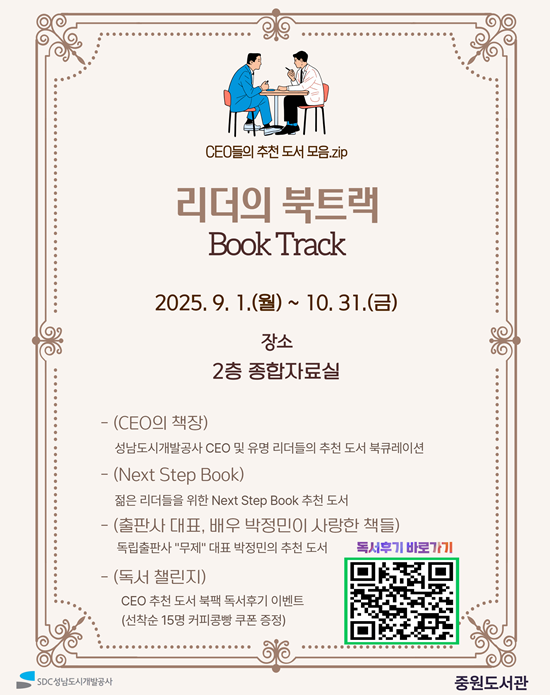 | ▲중원도서관은 유명 리더들이 추천한 도서를 모아 소개하는 ‘리더의 북트랙’을 9월 1일부터 운영한다.(사진=성남도시개발공사) |