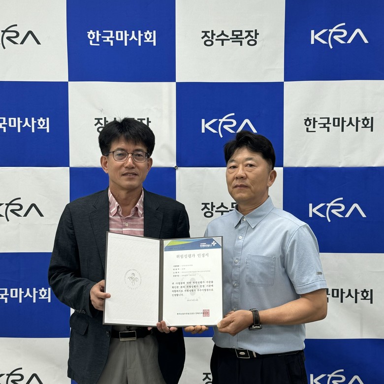 [세계타임즈 = 송민수 기자] 한국마사회(회장 정기환) 장수목장은 한국산업안전보건공단 전북지역본부로부터 지난 4일 ‘위험성평가 우수사업장’으로 인정받았다고 밝혔다. 한국산업안전보건공단이 주관하는 ‘위험성평가 우수사업장 인정제도’는 사업장의 위험성평가 실태를 기준에 따라 객관적으로 심사하고, 기준에 적합한 사업장에 인정서를 발급하는 제도다.