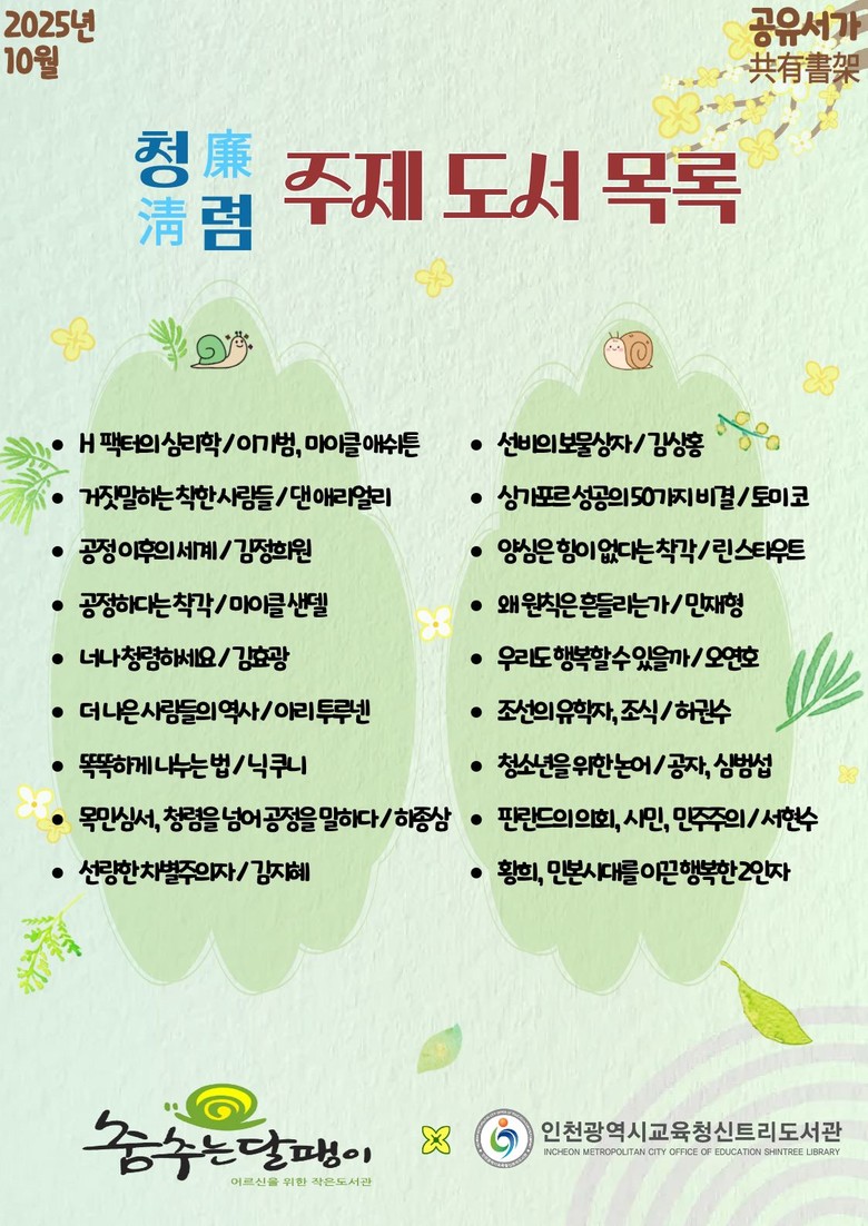 전시는 신트리도서관 신관 1층 봄누리에서 열리며, 자세한 사항은 종합자료실(☎032-363-5046)로 문의하면 된다.