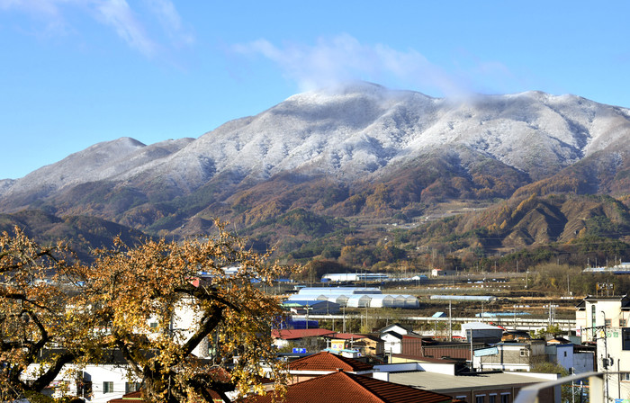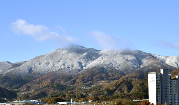 | ▲전날 내린 눈이 쌓여 단풍과 함께 대비되는 색을 보여주고 있는 팔공산 |