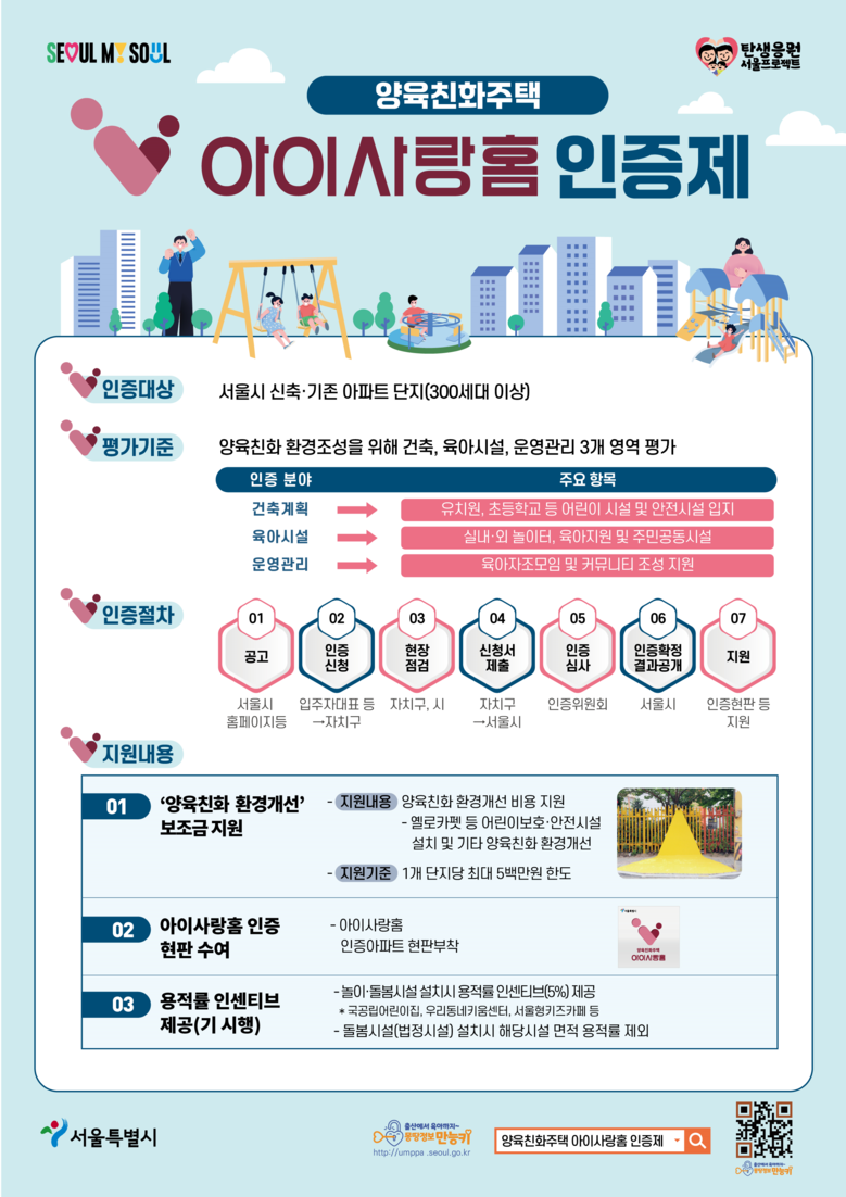 - '24년부터 육아지원시설 등 양육친화 주거환경 갖춘 서울시내 아파트 총 25개소 인증 [서울 세계타임즈=이장성 기자] 서울시가 아이 키우기 좋은 주거환경을 갖춘 아파트 단지를 인증하고 최대 500만 원의 보조금까지 지원하는 ‘양육친화주택 아이사랑홈 인증제’에 참여할 아파트를 21일(화)부터 한 달간 모집한다.