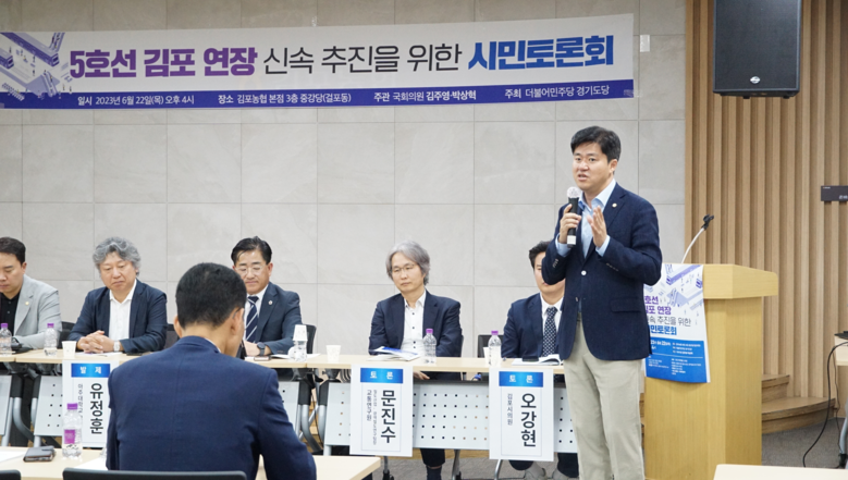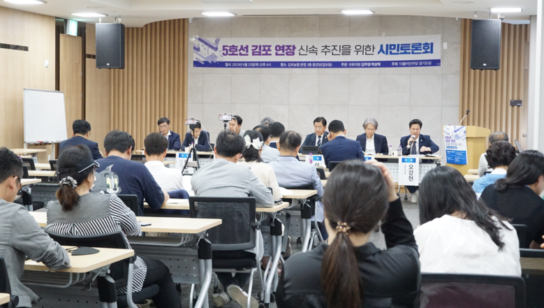 [세계타임즈 = 심귀영 기자] 6월 22일(목) 오후 4시 김포시 걸포동 김포농협 본점 3층 중강당에서 더불어민주당 김주영·박상혁 국회의원이 주관하고 더불어민주당 경기도당이 주최하는 「5호선 김포 연장 신속 추진을 위한 시민토론회」가 개최되었다.