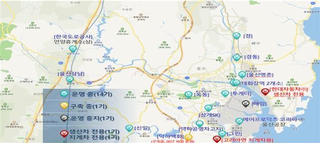 한편 울산시는 수소차 친화 도시 구현을 위해 전국 최대 규모의 수소 배관망을 기반으로 지난 2009년부터 수소전기차 충전소 구축에 나서 덕하공영차고지 수소충전소를 시작으로 태화강역 수소충전소까지 현재 총 16개소의 수소충전소를 구축.운영 중이다.