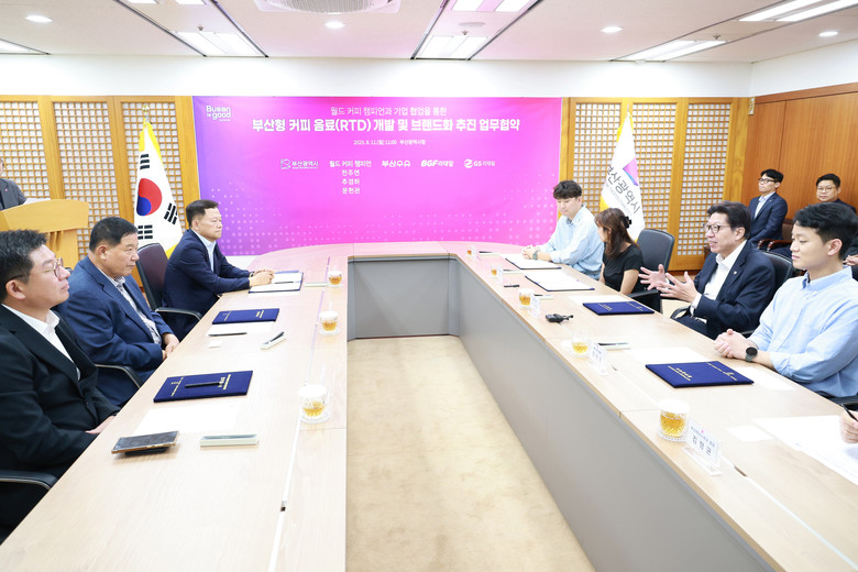 ◈ 개발된 음료는 9월 열리는 '부산은 커피데이' [세계타임즈=부산 이용우 기자] 부산시(시장 박형준)는 오늘(11일) 오전 11시 시청 7층 국제의전실에서 월드커피챔피언 3인, 부산경남우유협동조합, ㈜비지에프(BGF)리테일, ㈜지에스(GS)리테일과 함께 「부산형 커피 음료(RTD*) 개발 및 브랜드화 추진 업무협약」을 체결한다고 밝혔다.