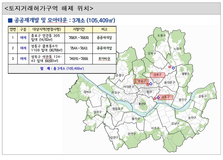 대상지는 ▴공공재개발 후보지 취소 지역으로 종로구 연건동 305일대(0.01㎢), 성동구 금호동4가 1109일대(0.03㎢) ▴모아타운 대상지 철회 지역 성북구 석관동 124-42 일대(0.06㎢)이다.