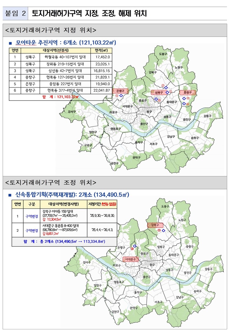 시는 신속통합기획 주택재개발 구역인 강북구 미아동 159 일대, 서대문구 홍은동 8-400 일대는 구역계 변경으로 제척된 토지를 제외해 토지거래허가구역을 조정했다. 2개 구역의 지정기간은 기존과 동일하게 유지된다.