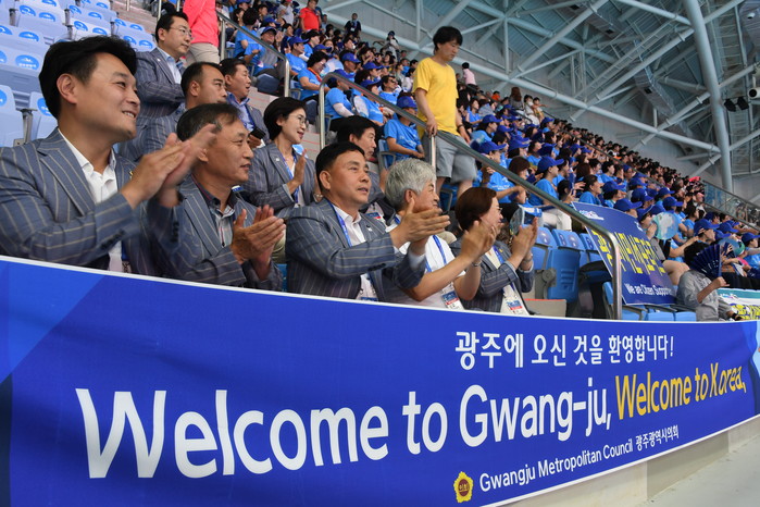 [광주=세계타임즈 손권일 기자] 광주광역시의회(김동찬 의장) 시의원 일동과 사무처 임직원들은 16일 2019광주세계수영선수권대회 아티스틱 수영경기가 열리는 염주체육관과 다이빙 경기장인 남부대학교 국제수영장을 방문해 선수들을 응원하고 수영대회조직위원회 직원들과 자원봉사자들을 격려했다.