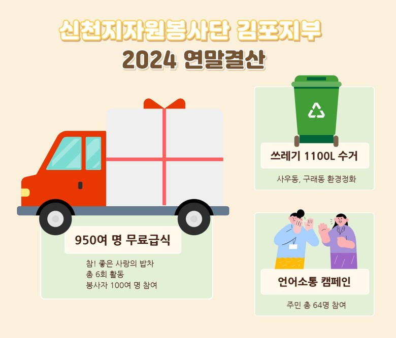 먼저 ‘참! 좋은 사랑의 밥차’는 김포시 자원봉사센터와의 협력으로 올해 총 6회 실시됐으며, 총 950여 명의 어르신들에게 무료 급식을 제공했다. 또 따뜻한 식사뿐 아니라 평소 접하기 힘든 공연을 함께 펼쳐 정서적 충족 및 다채로운 경험을 할 수 있도록 도왔다.