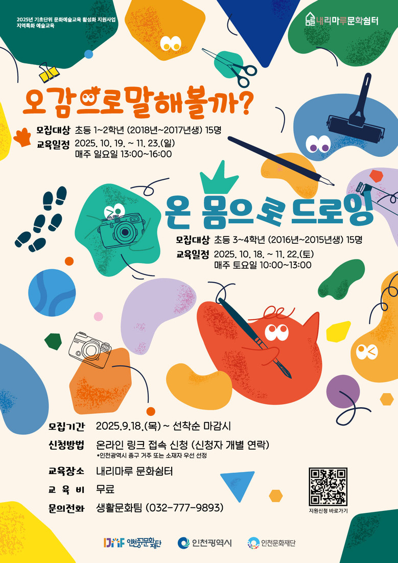 이번 프로그램은 (재)인천중구문화재단이 주최·주관하고, 인천광역시, (재)인천문화재단이 후원하는 ‘2025년 기초단위 문화예술교육 활성화 지원사업’의 일환으로 ▲온 몸으로 드로잉, ▲오감으로 말해볼까? 총 2가지로 구성됐다.