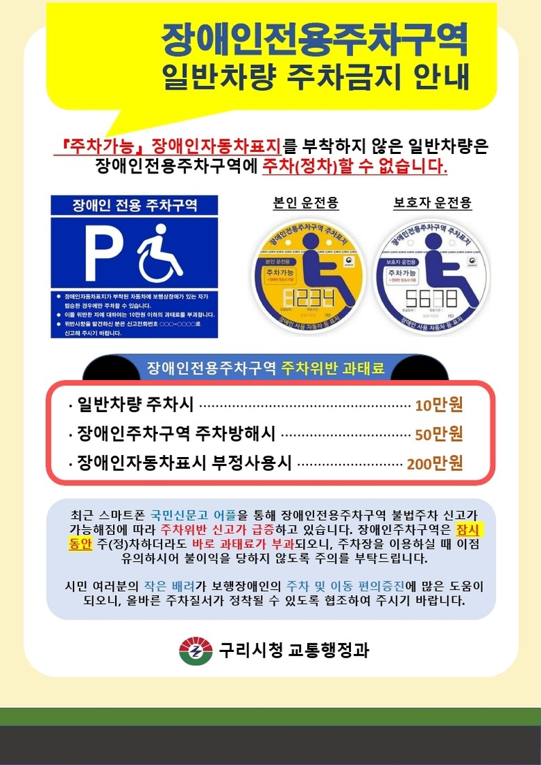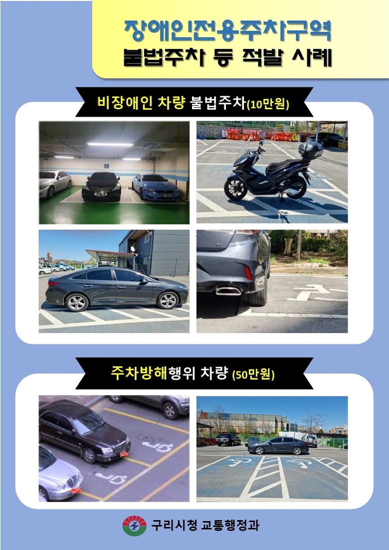구리시 관계자는 “장애인전용주차구역은 단순한 주차 공간이 아닌 장애인과 이동 약자의 이동권을 보장하는 배려의 공간”이라며, “시민 모두가 관심을 가지고 올바른 이용 문화가 정착될 수 있도록 지속적으로 노력하겠다.”라고 밝혔다.
