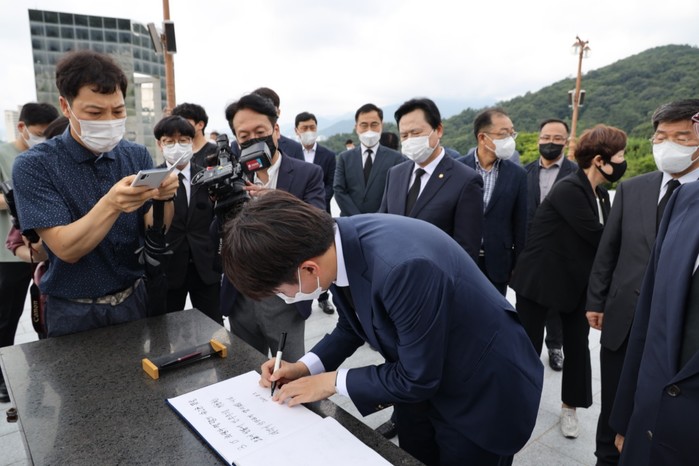 [세계타임즈 이진화 기자] 이준석 국민의힘 대표가 3일 오전 경남 창원의 국립3·15민주묘지를 찾아 참배한 후 방명록에 서명했다.