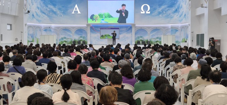 신천지 전주교회에서 참석자가 강연을 경청하고 있다.