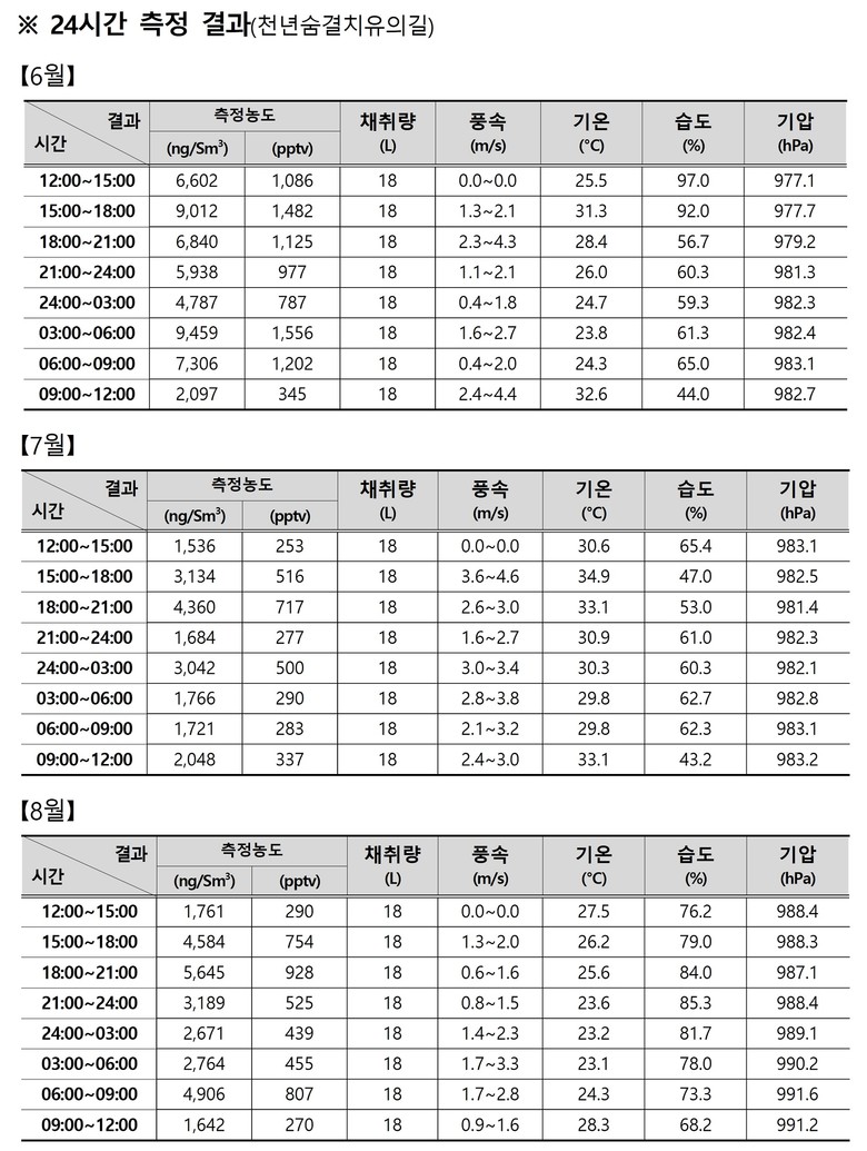 솔향수목원 내 다섯 지점을 조사한 결과, 수목 생리가 활성화된 6월에 5,314~8,716 ng/Sm3로 가장 높게 측정되었고, 7월(1,280 ~2,115 ng/Sm3)과 8월(1,761~3,592 ng/Sm3)에도 높은 수준의 피톤 치드가 방출되는 것으로 나타났다.