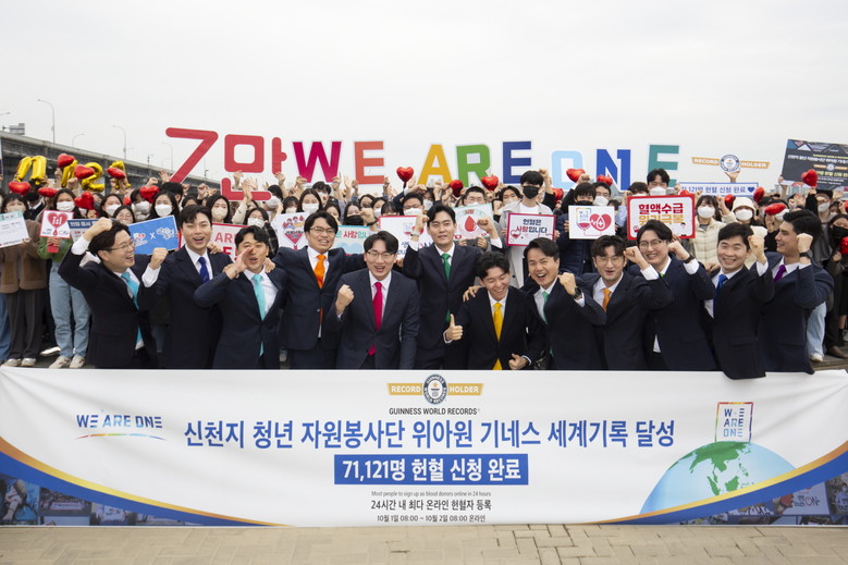 [세계타임즈 백진욱 기자] 한국의 청년 자원봉사단 ‘위아원'(We Are One) 자원봉사단원들이 24시간 내 가장 많은 헌혈자 등록으로 기네스 세계기록에 등재됐다. 지난 1일 기네스 세계 기록 도전을 위해 '위아원'은 24시간 동안 7만 1천121명의 자원봉사자가 온라인 헌혈 신청을 마쳤다.