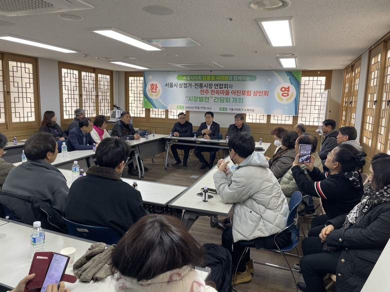 | ▲ 지난 11월 17일 서울시의회 별관 회의실에서 개최된 서울시상점가전통시장연합회와 전주한옥마을 어진포럼 상인회 간의 ‘시장발전 간담회’에서 상인들이 의견을 교류하고 있다. |