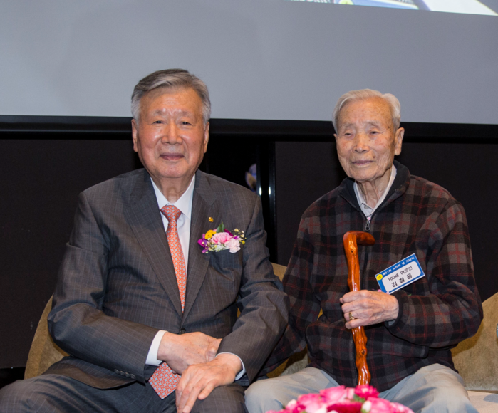 | ▲이중근 대한노인회 회장이 청려장을 증정 받은 김철용 어르신(서울 이태원 거주)과 함께 기념촬영을 하고 있다. |