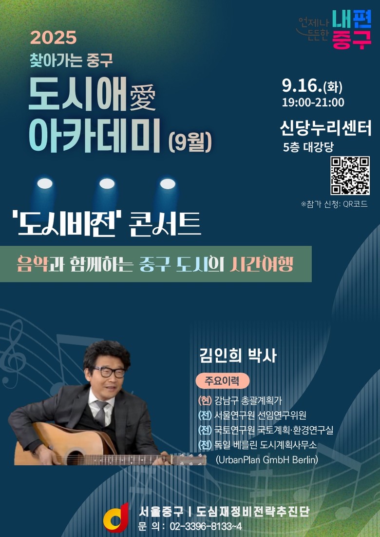 이번 아카데미는 ‘도시비전 콘서트’라는 부제와 함께, ‘음악과 함께하는 중구 도시의 시간여행’을 주제로 인문학과 도시계획을 결합한 색다른 강연이 진행된다.