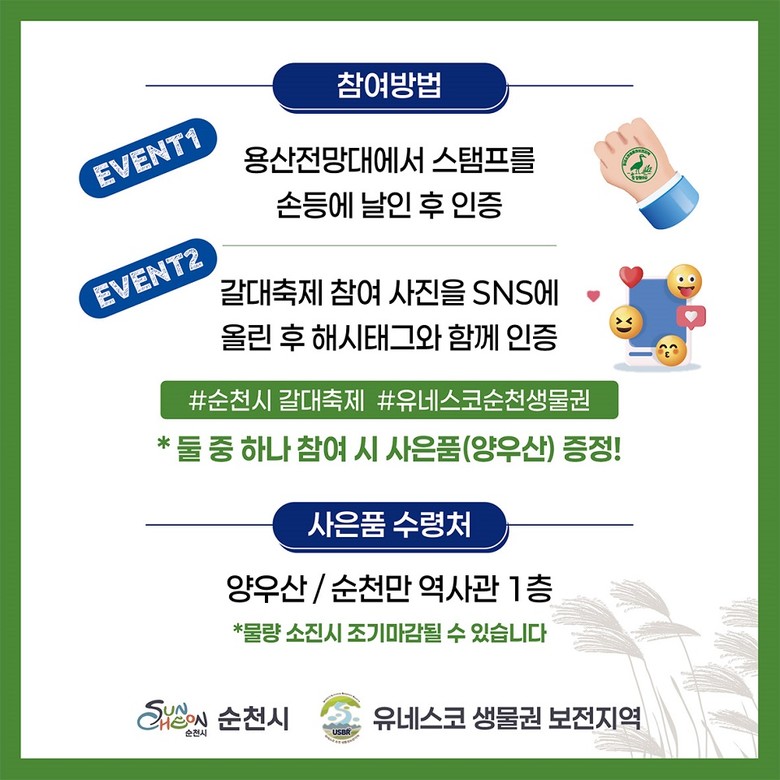 두 번째는 순천만갈대축제 현장에서 촬영한 사진을 #순천만갈대축제, #유네스코순천생물권 등의 해시태그와 함께 개인 SNS에 게시 후 순천만 역사관에서 인증하면 된다.