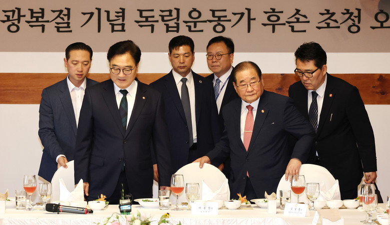[세계타임즈 = 심귀영 기자] 우원식 국회의장(왼쪽 두번째)과 이종찬 광복회장이 15일 오후 국회 사랑재에서 열린 제79주년 광복절 기념 독립운동가 후손 초청 오찬에 참석하고 있다. 2024.8.15