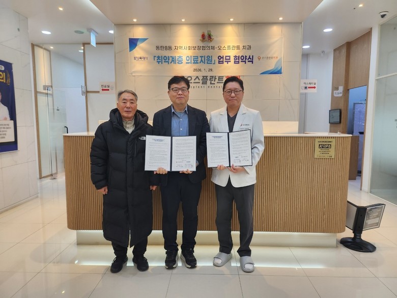 [화성시 세계타임즈=송민수 기자] 동탄8동 지역사회보장협의체가 오스플란트 치과, 작은마을한의원와 지난 29일 ‘지역 내 취약계층 건강 증진과 의료 접근성 강화를 위한 의료지원 협약’을 체결했다.