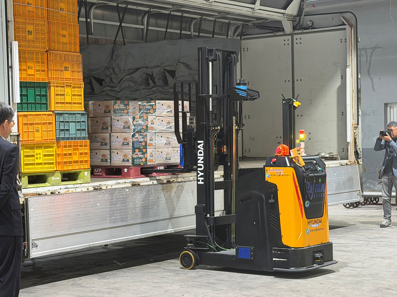 현장에서는 무인지게차 1기, 저상형 자율이동로봇(AMR) 1기, 청소 및 경비로봇 1기 등 총 3기의 첨단 장비가 투입되어 유기적으로 협업하는 자동화 시퀀스를 선보였다. 운전자가 없는 지게차가 농산물 파렛트의 위치를 정확히 인식해 트럭에서 하역하면, 자기 무게의 수십 배를 적재할 수 있는 AMR이 이를 넘겨받아 경매장 내 목표 구역으로 매끄럽게 운반했다. 운반이 끝난 주변은 청소로봇이 즉각적으로 먼지 흡입과 물청소를 수행해 참석한 유통인들의 호응을 얻어냈다.