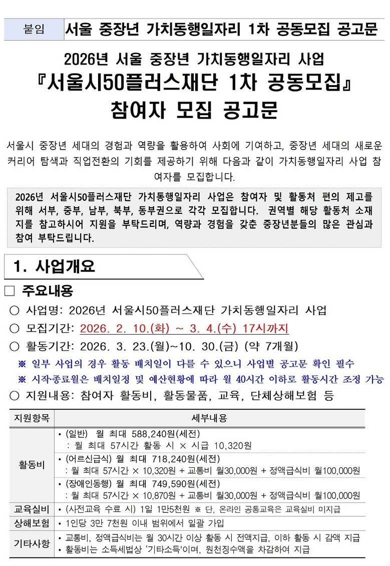 참여 신청은 2월 10일(화)부터 3월 4일(수) 17시까지 서울시50플러스일자리몽땅 누리집(50plus.or.kr)을 통해 온라인으로 접수하며, 이후 서류 심사와 면접을 거쳐 3월 중순 최종 합격자를 발표한다.
