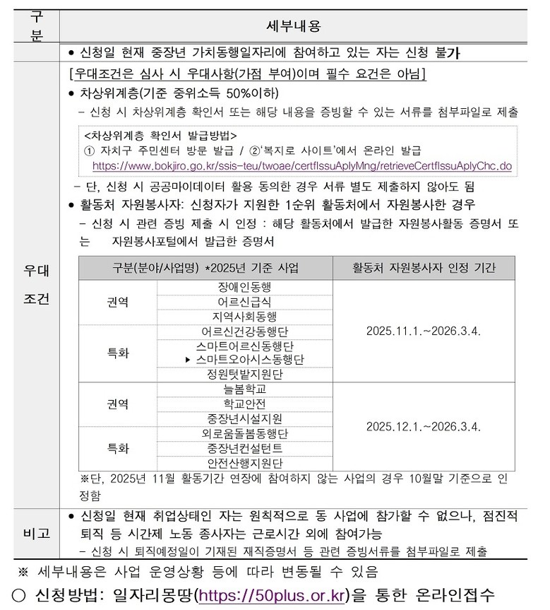서부·중부·남부·북부·동부 등 5개 권역별 일자리는 어르신 급식 지원, 장애인 동행 등 공통된 직무를 수행하며, 신청자는 본인의 생활권과 가까운 권역을 선택해 신청할 수 있다.